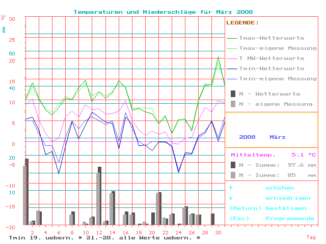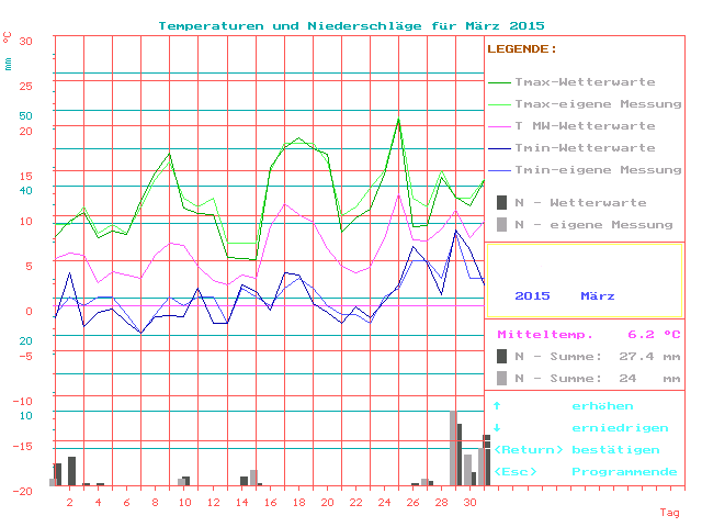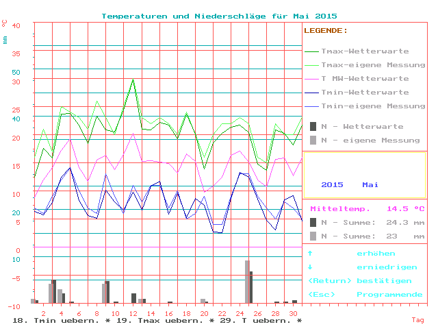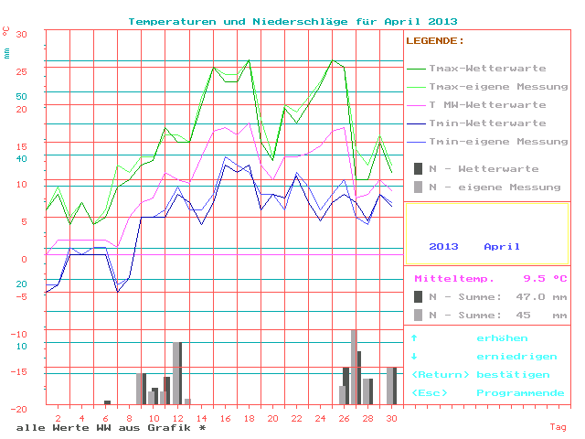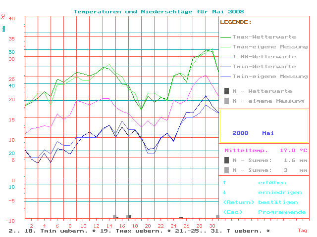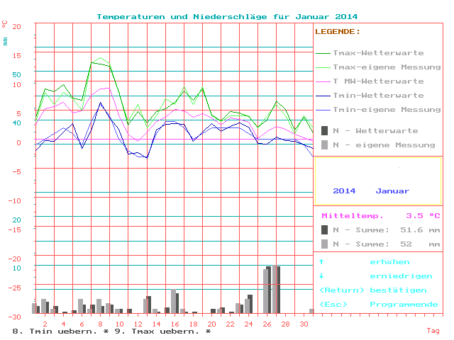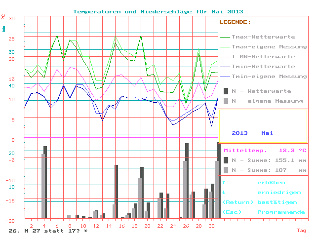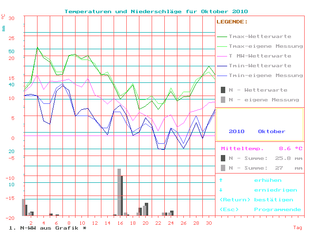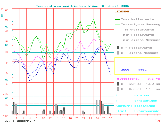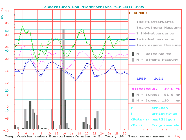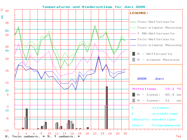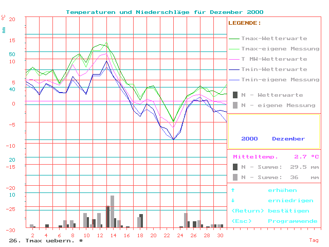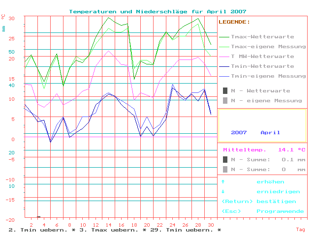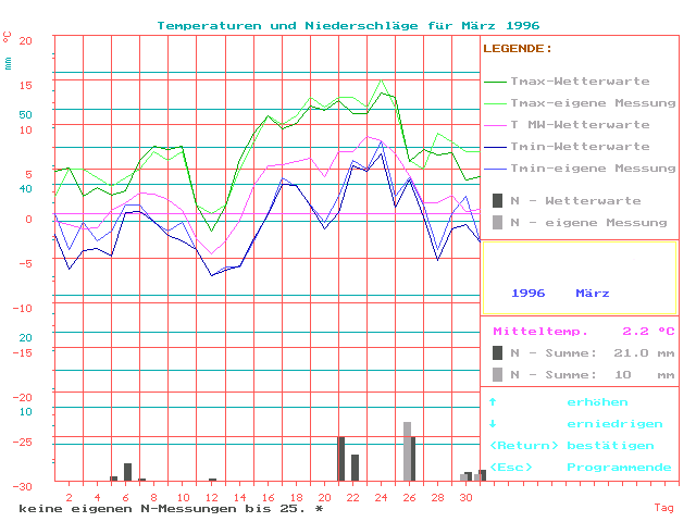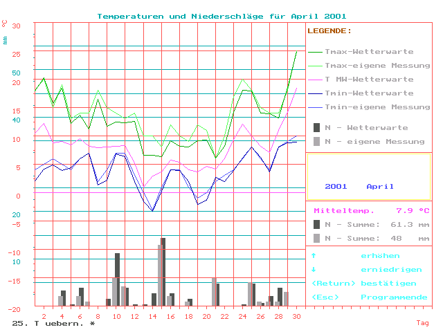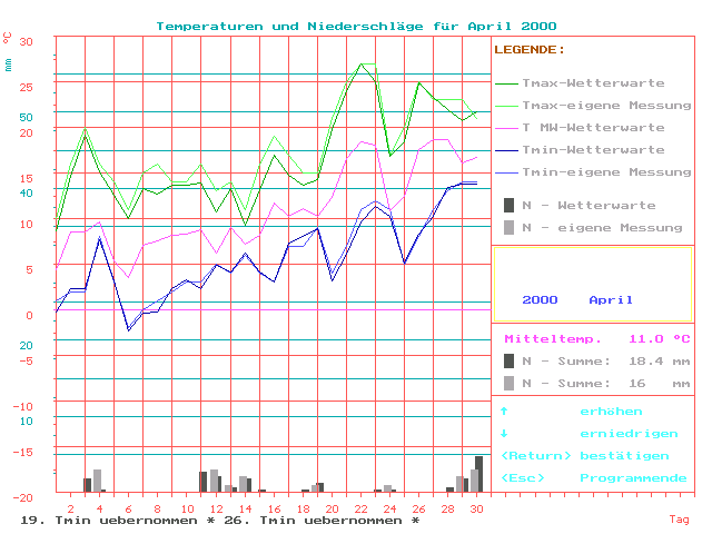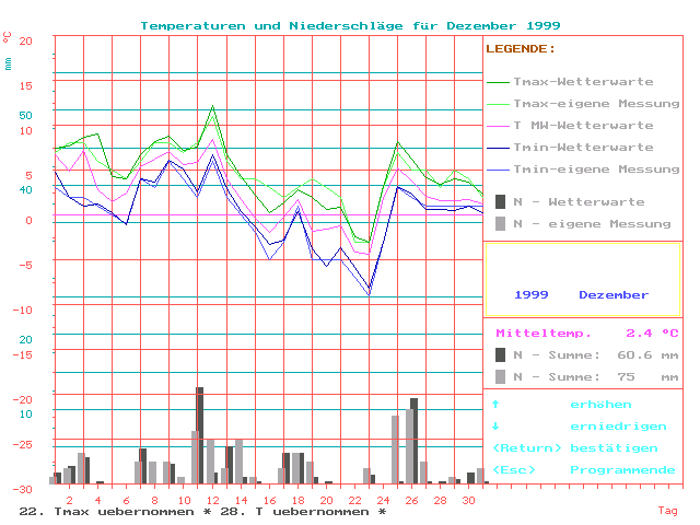 Die Angaben unter der Grafik bedeuten, dass am 25. eine eigene Messung für die Tageshöchsttemperatur fehlt und der Wert der PWSD übernommen wurde, am 26. gilt das gleiche für die Minimaltemperatur.