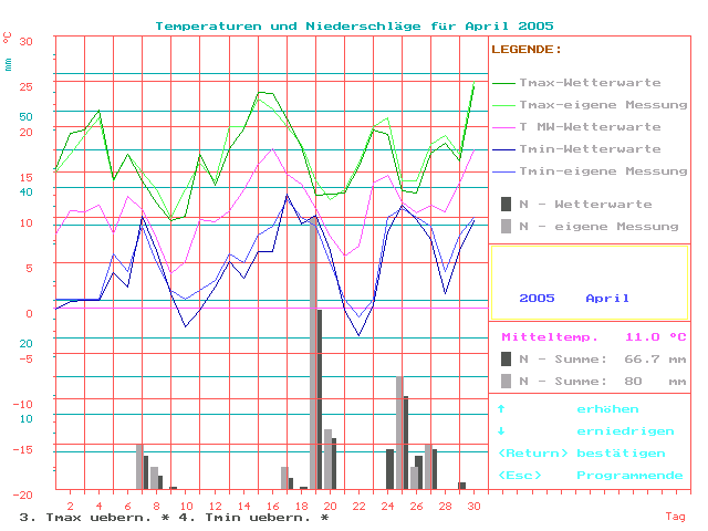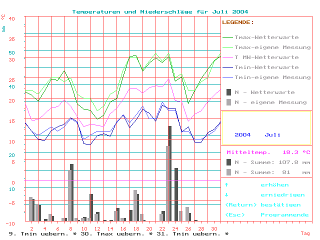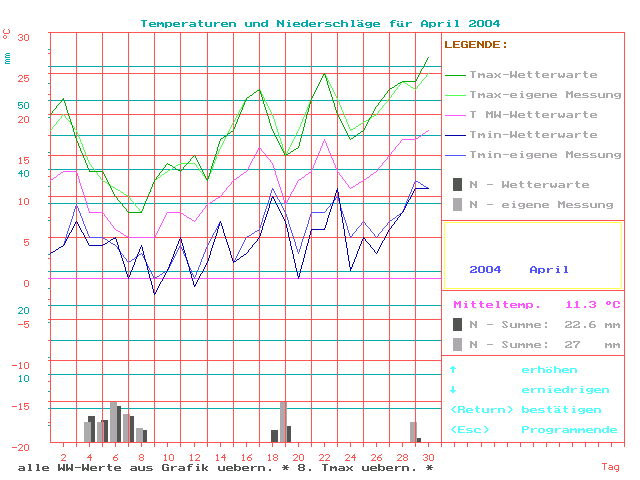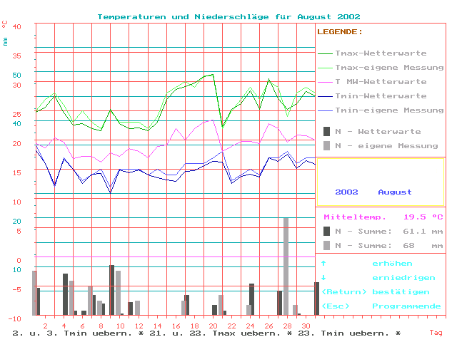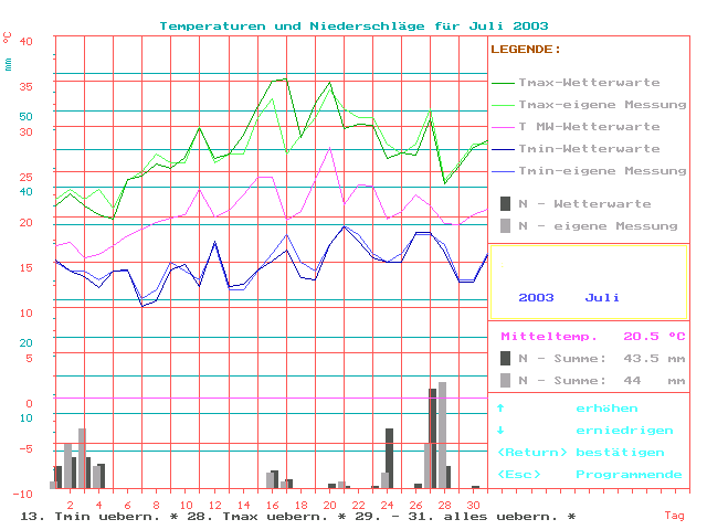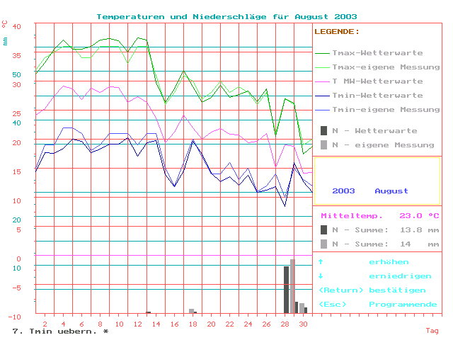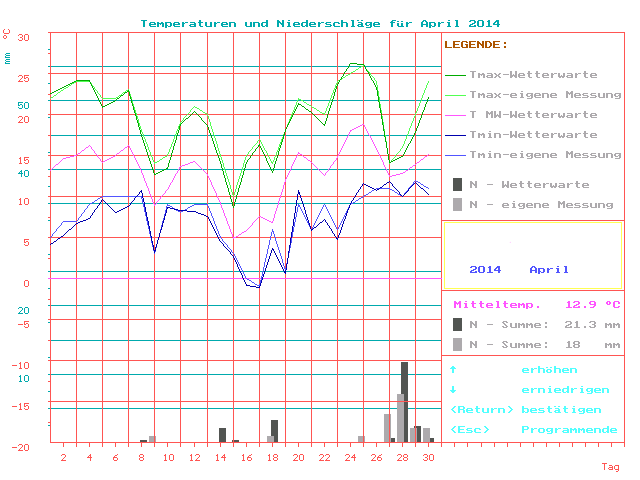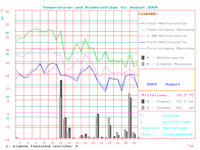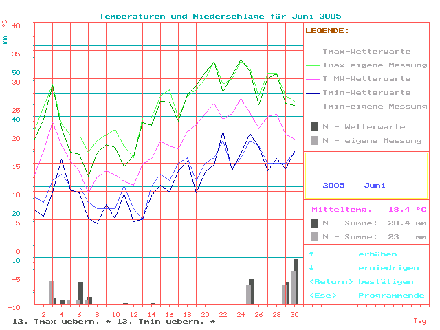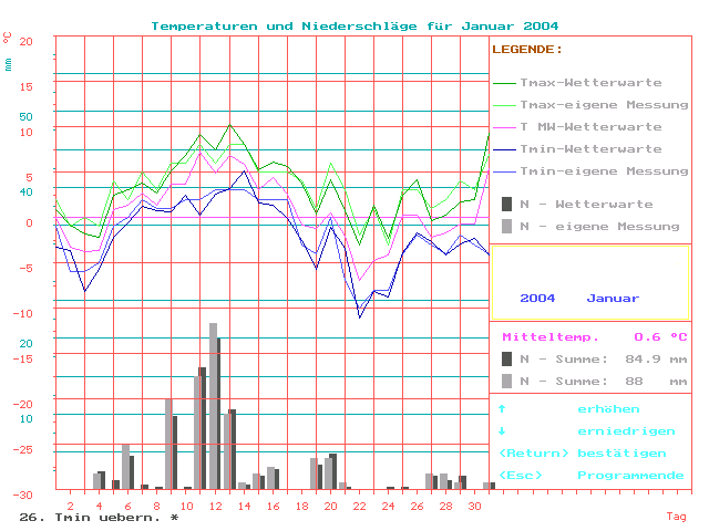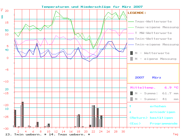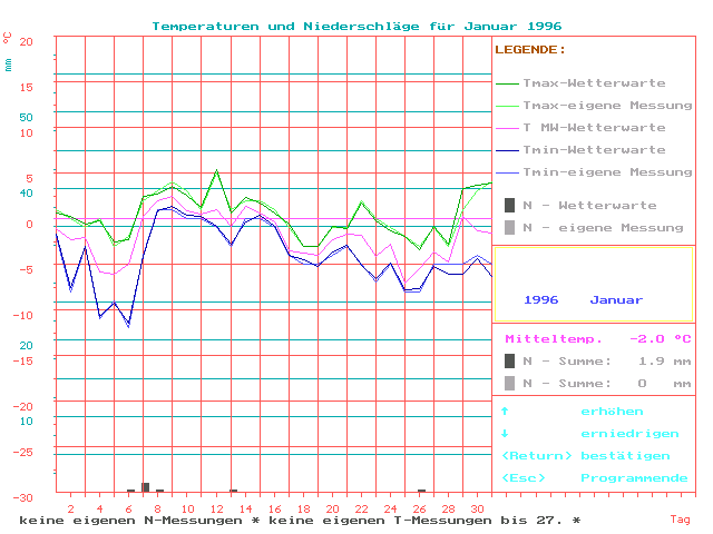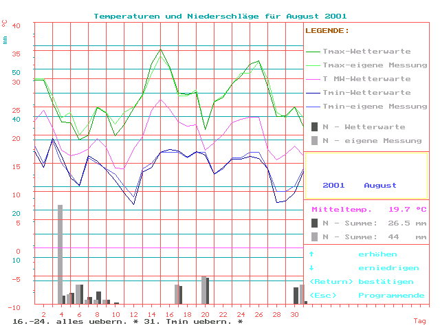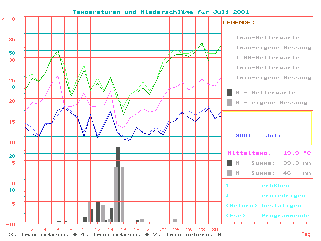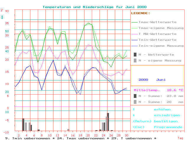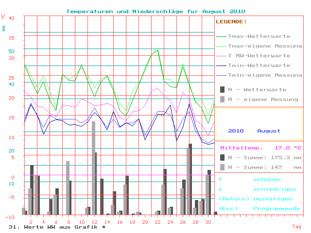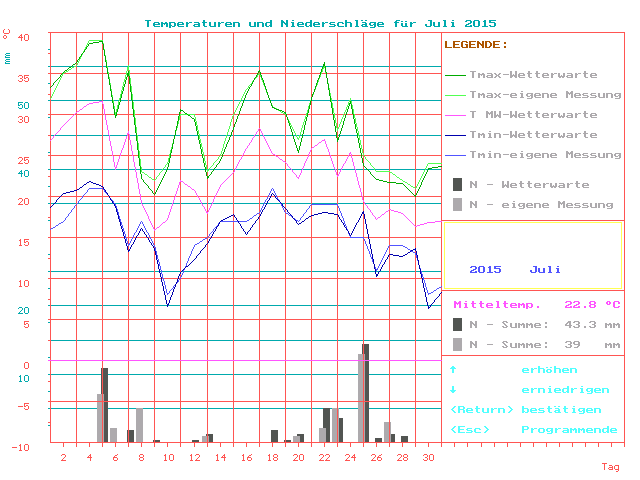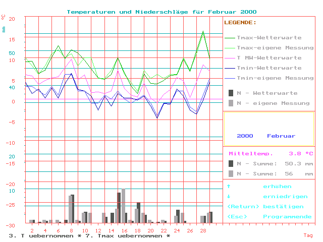 Die Angaben unter der Grafik bedeuten, dass am 25. eine eigene Messung für die Tageshöchsttemperatur fehlt und der Wert der PWSD übernommen wurde, am 26. gilt das gleiche für die Minimaltemperatur.