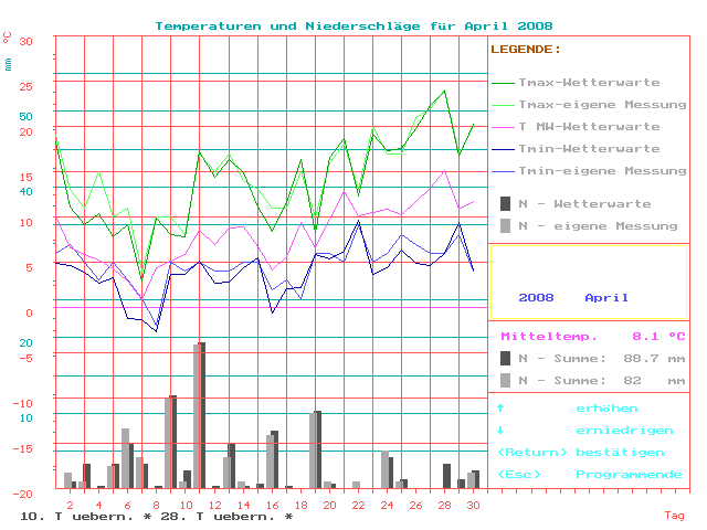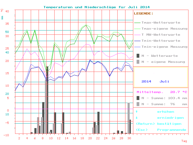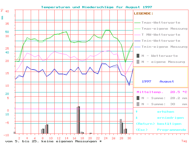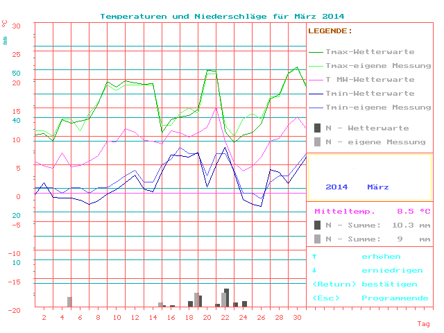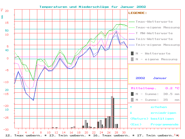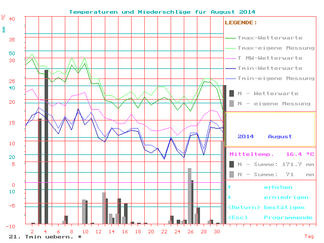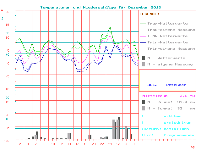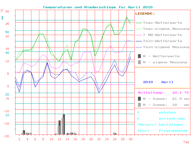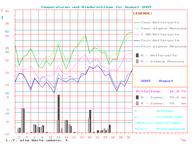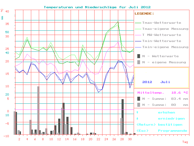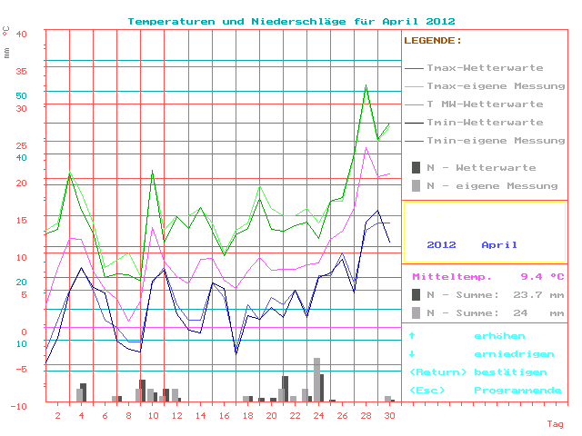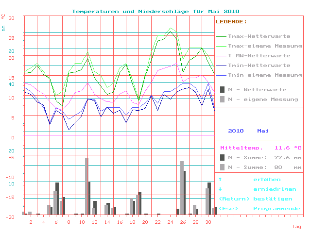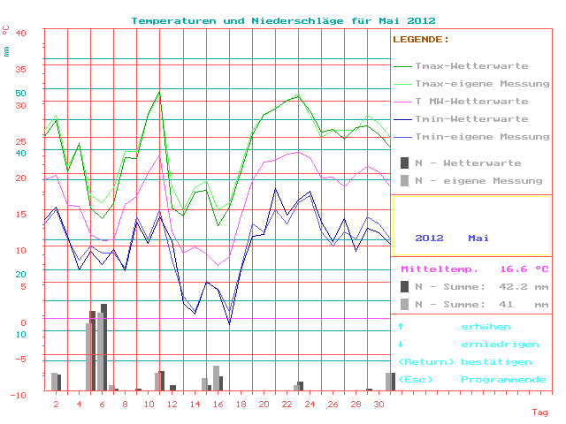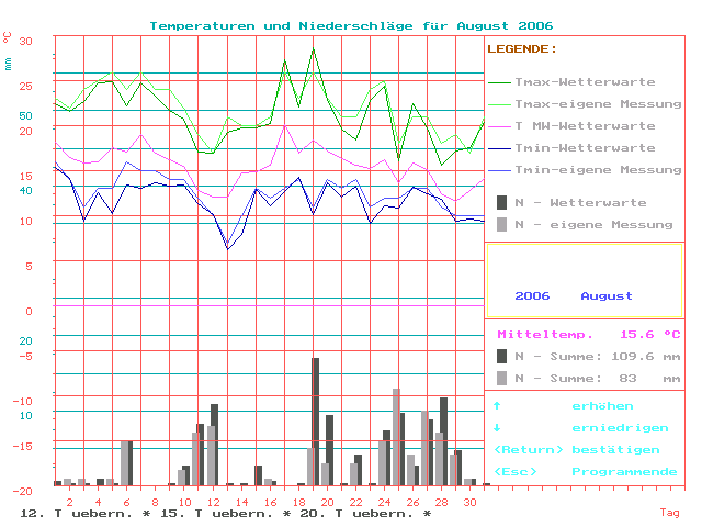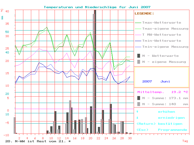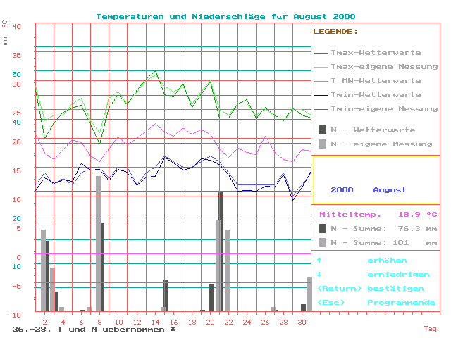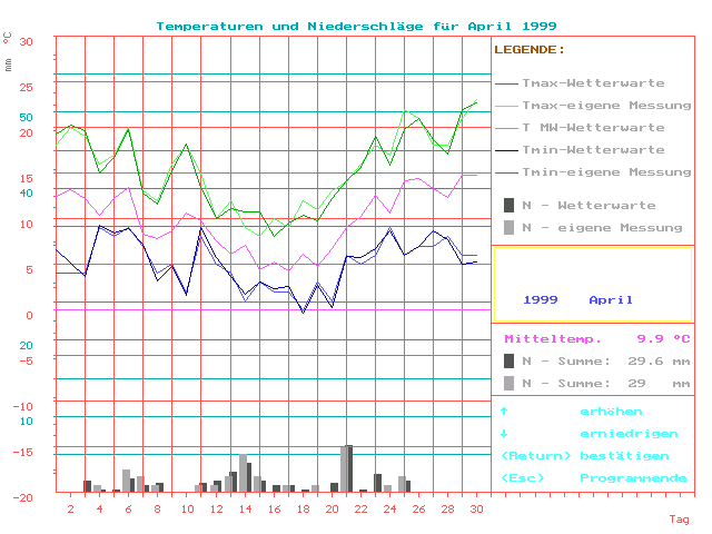 Die Angaben unter der Grafik bedeuten, dass am 25. eine eigene Messung für die Tageshöchsttemperatur fehlt und der Wert der PWSD übernommen wurde, am 26. gilt das gleiche für die Minimaltemperatur.