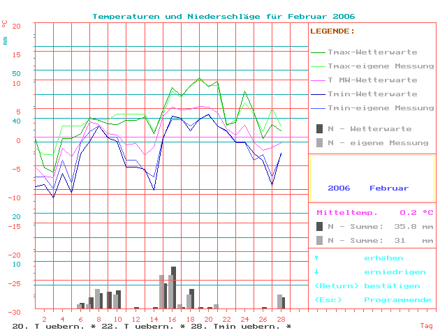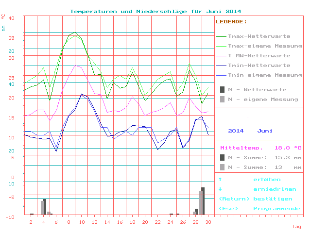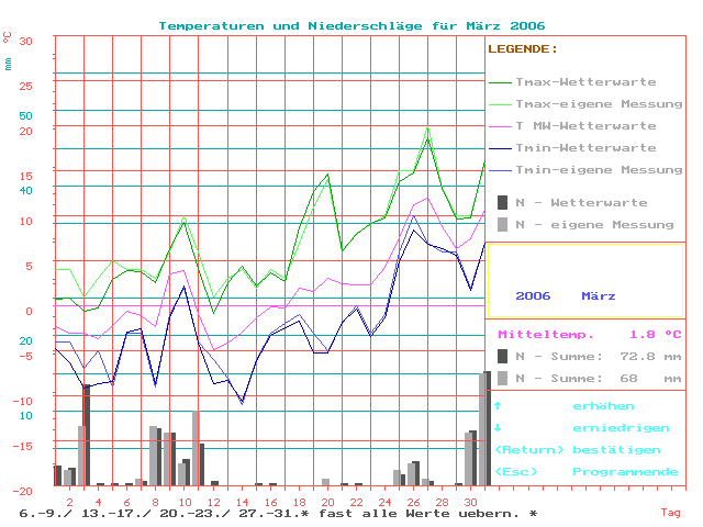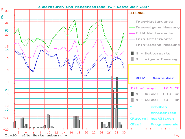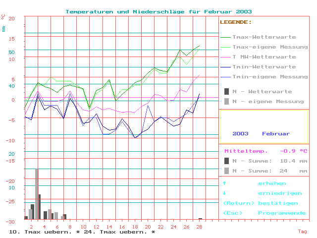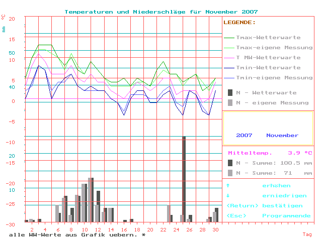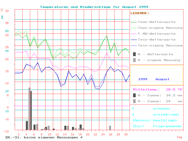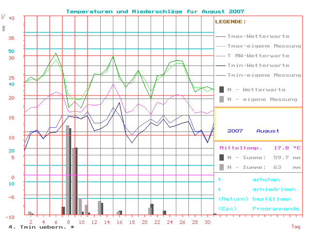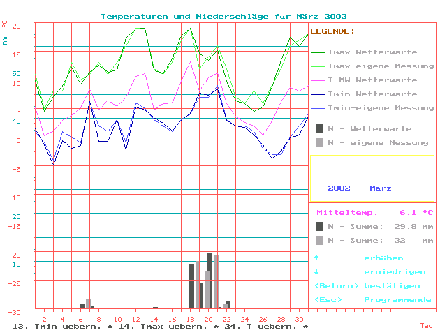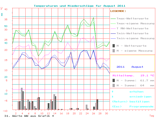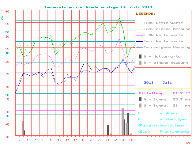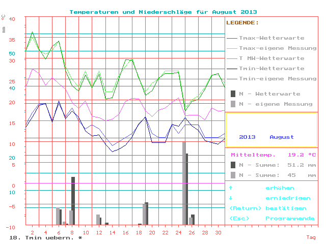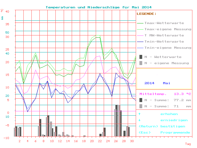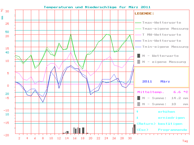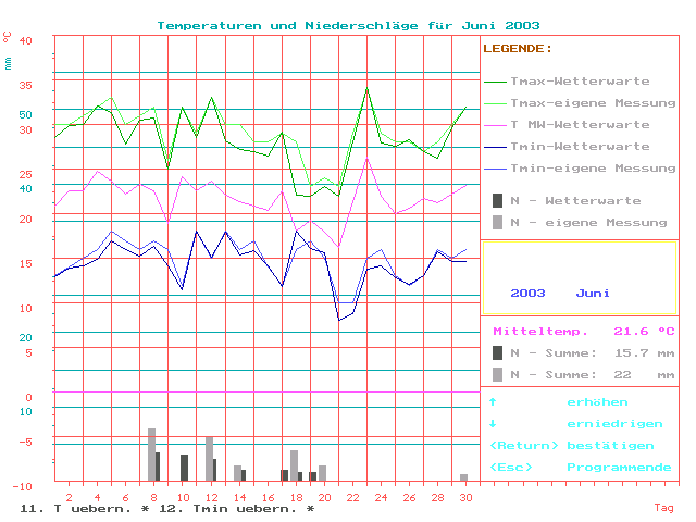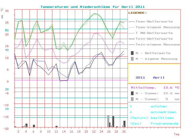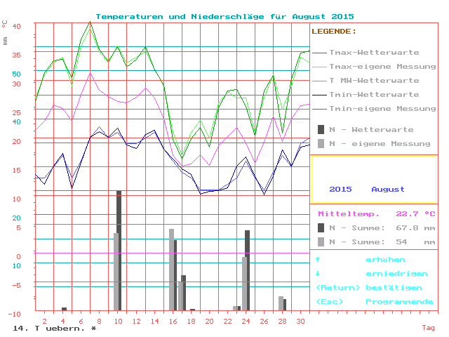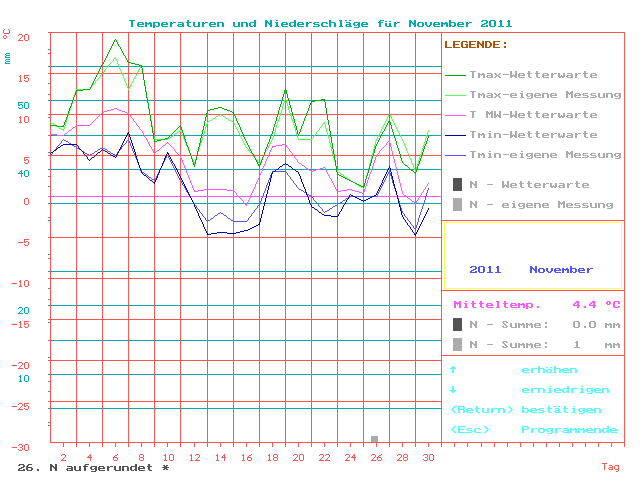 Die Angaben unter der Grafik bedeuten, dass am 25. eine eigene Messung für die Tageshöchsttemperatur fehlt und der Wert der PWSD übernommen wurde, am 26. gilt das gleiche für die Minimaltemperatur.