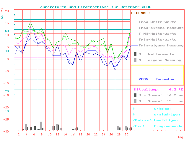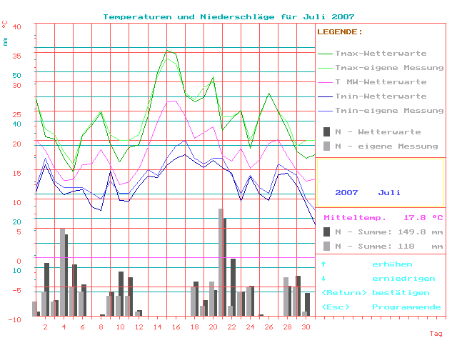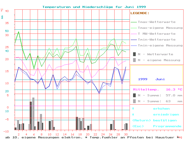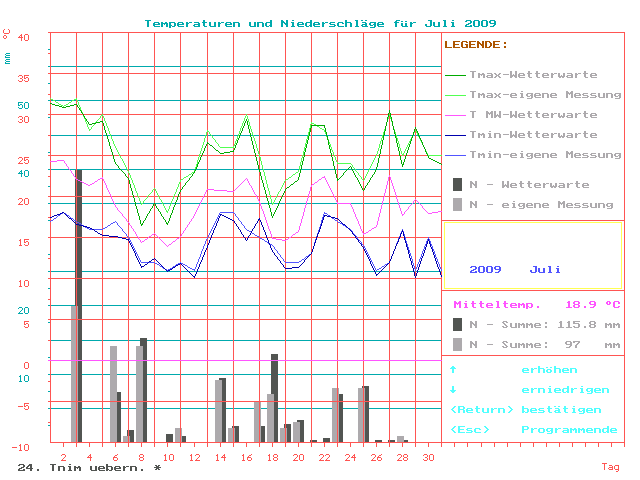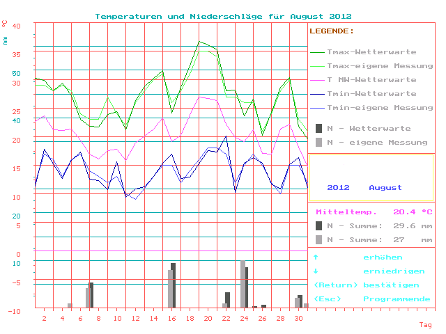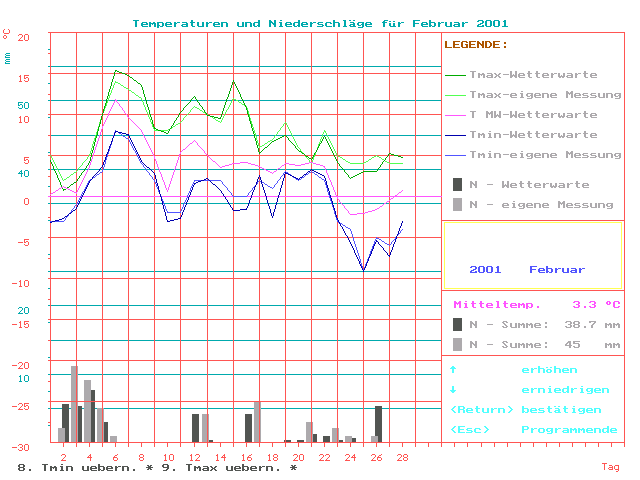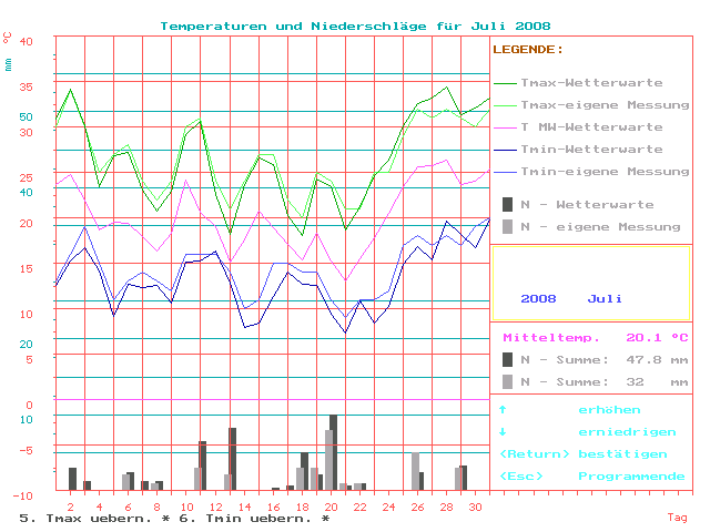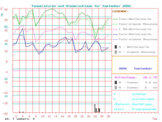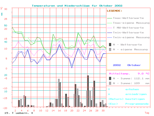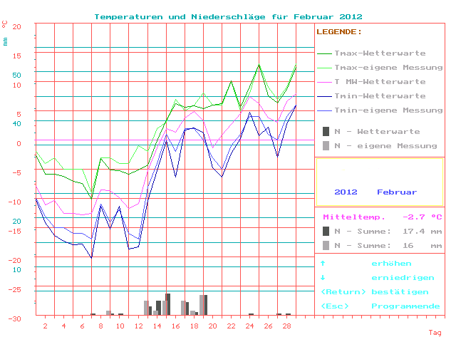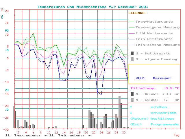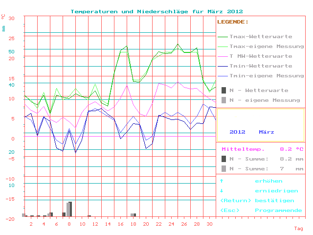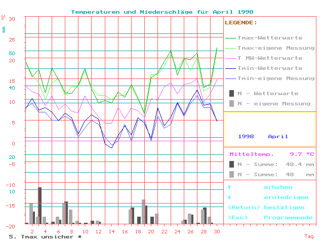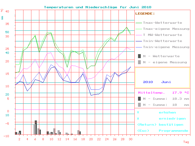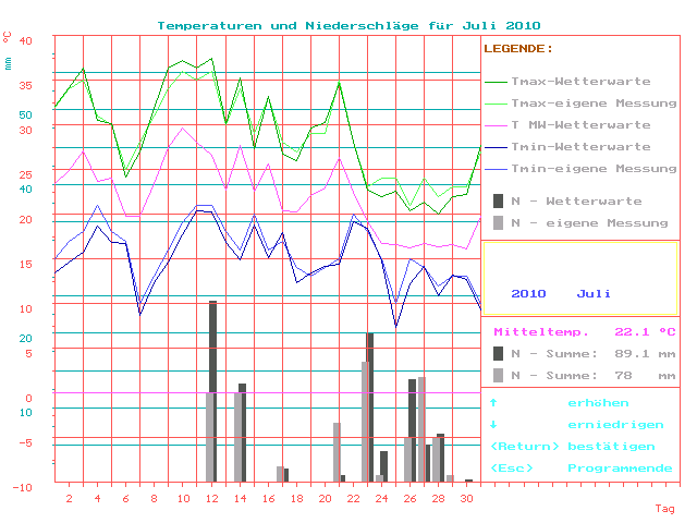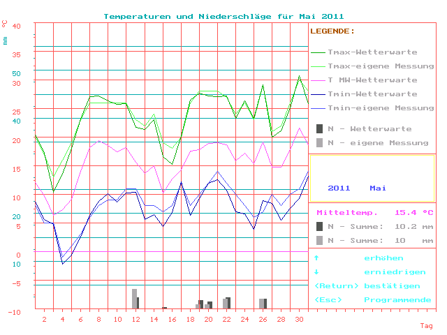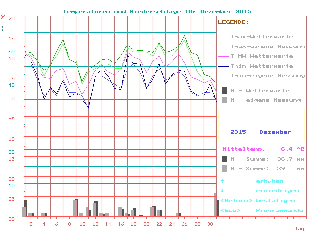 Die Angaben unter der Grafik bedeuten, dass am 25. eine eigene Messung für die Tageshöchsttemperatur fehlt und der Wert der PWSD übernommen wurde, am 26. gilt das gleiche für die Minimaltemperatur.