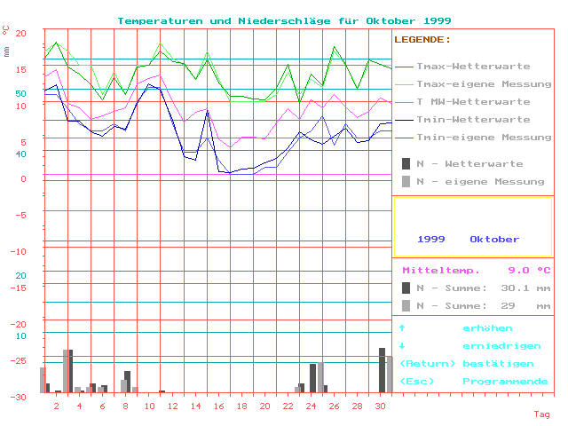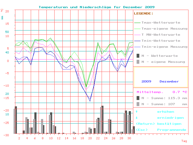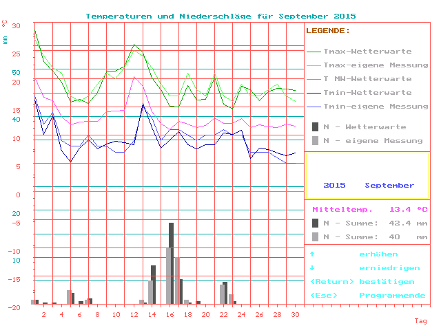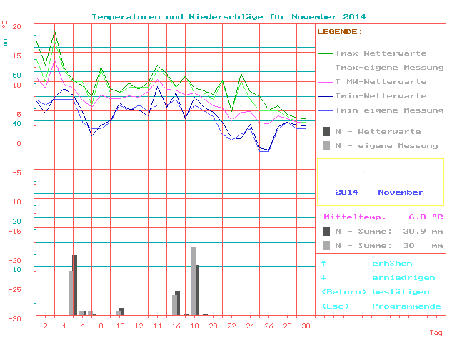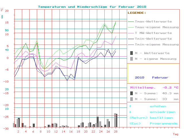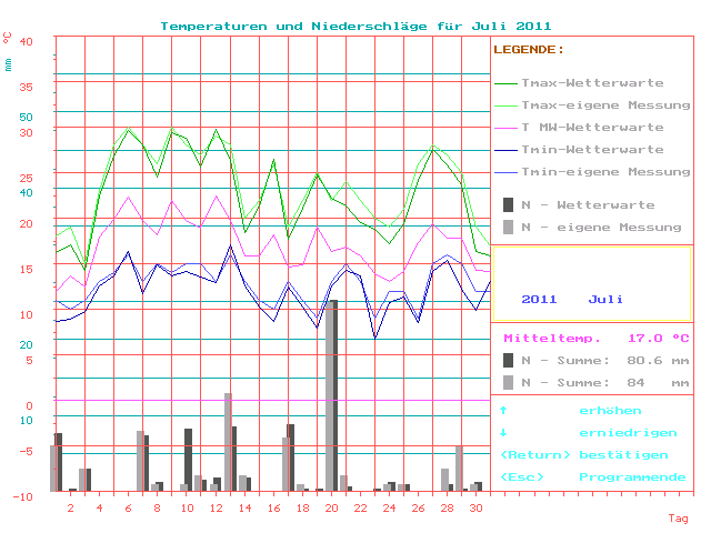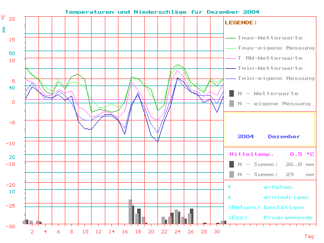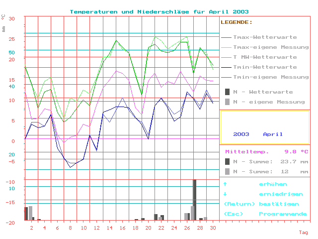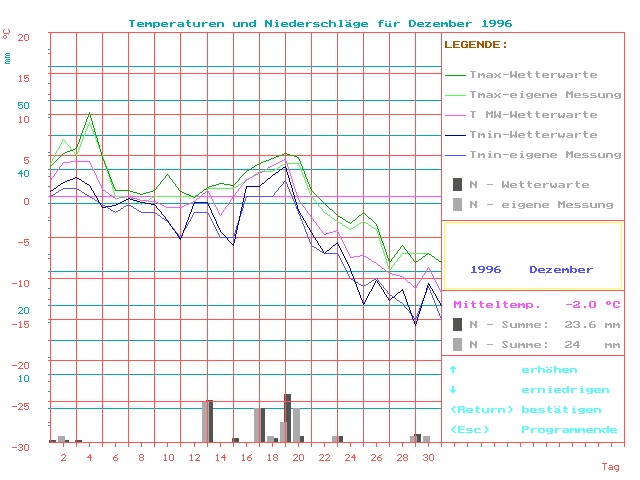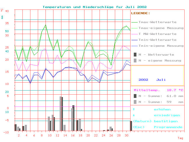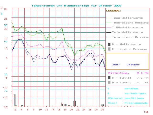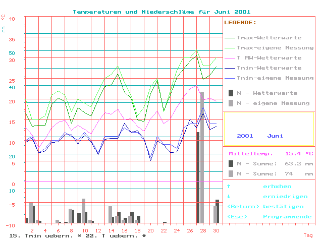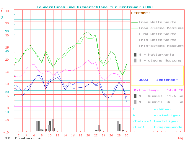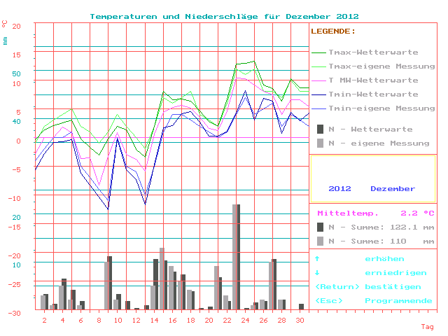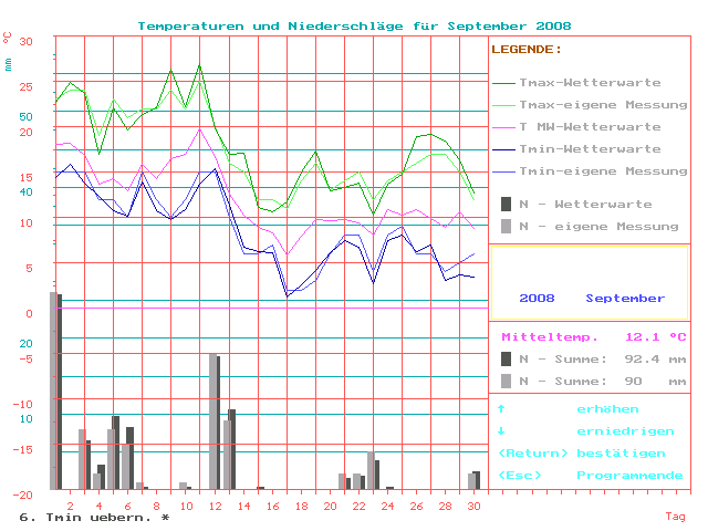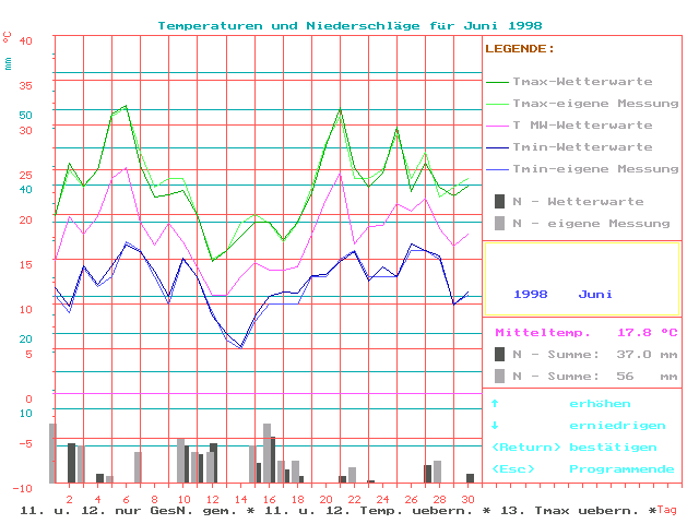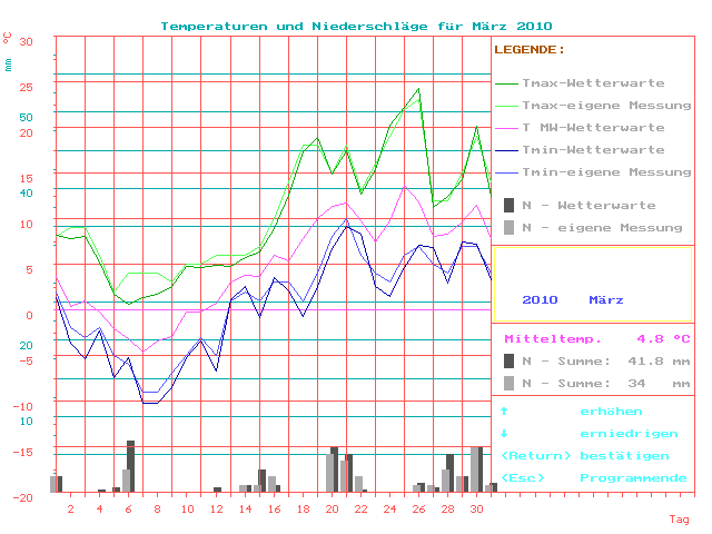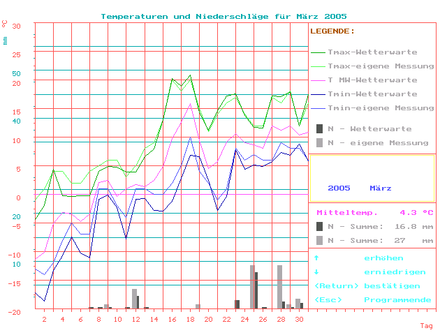 Die Angaben unter der Grafik bedeuten, dass am 25. eine eigene Messung für die Tageshöchsttemperatur fehlt und der Wert der PWSD übernommen wurde, am 26. gilt das gleiche für die Minimaltemperatur.