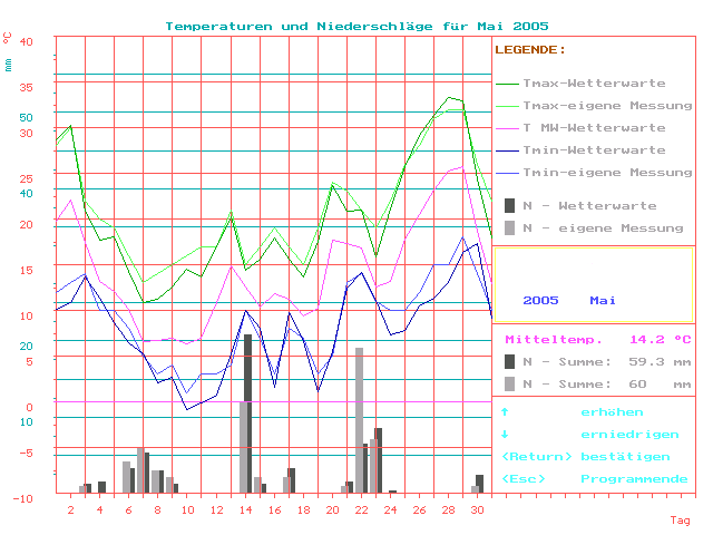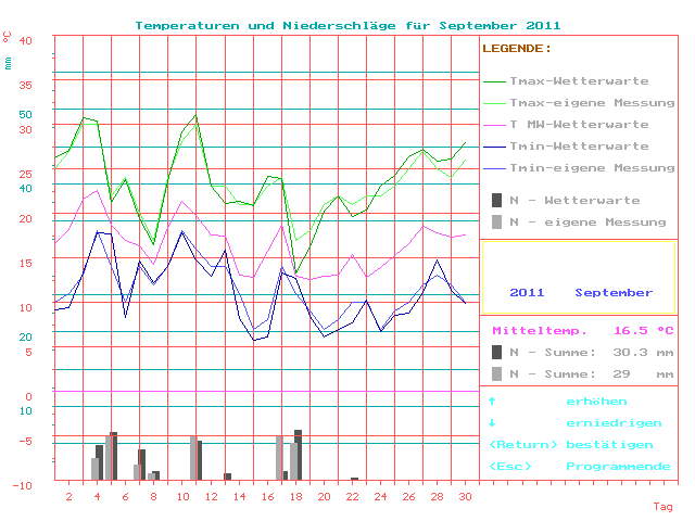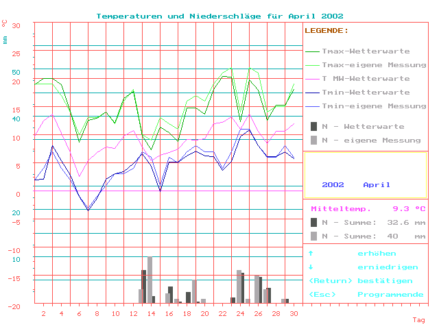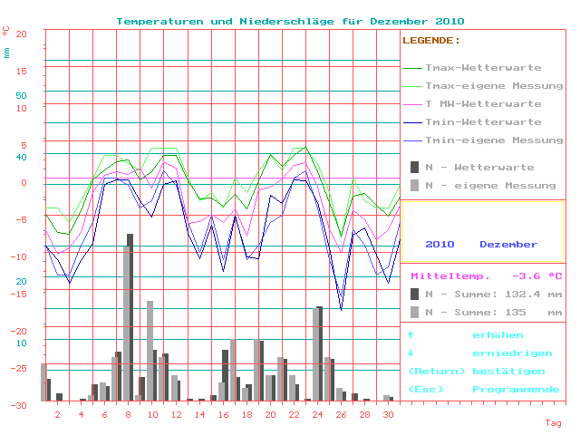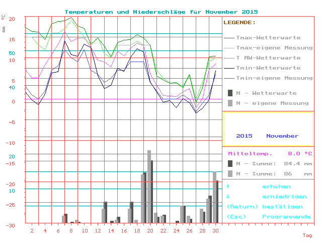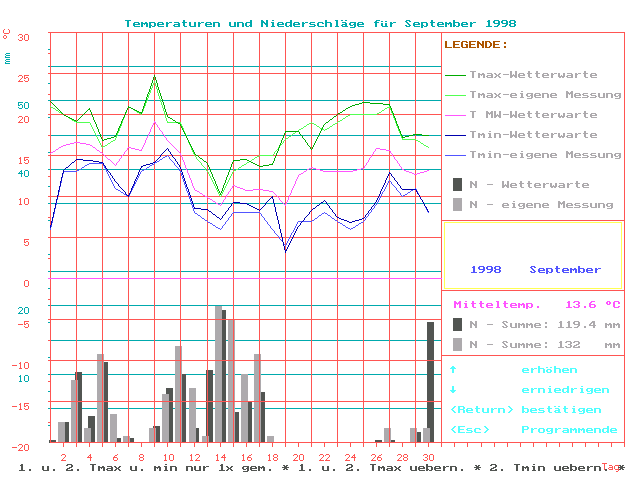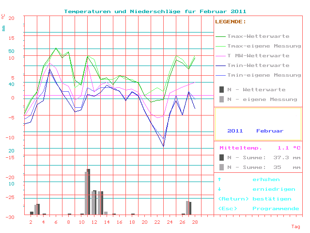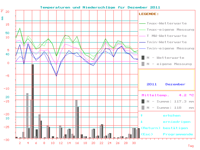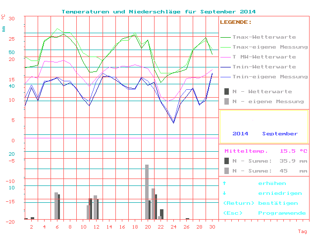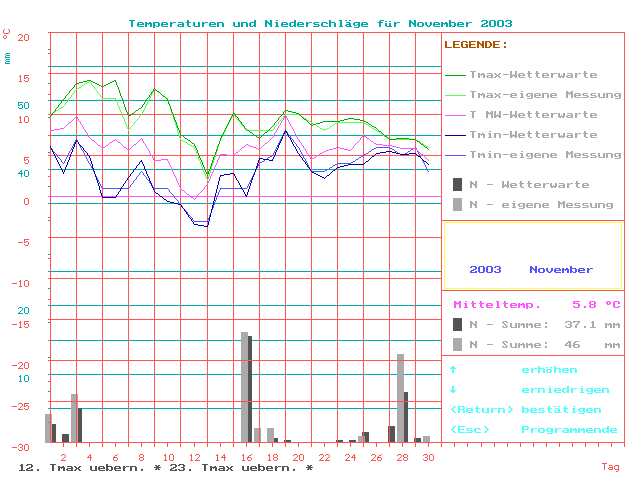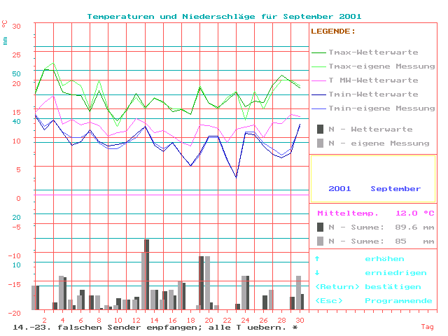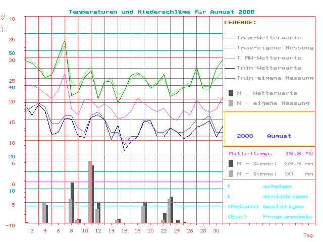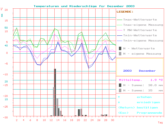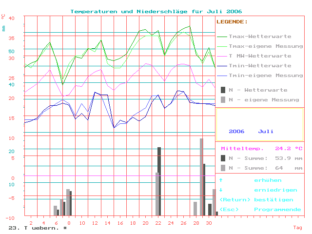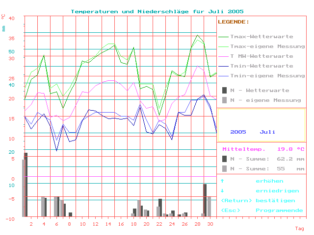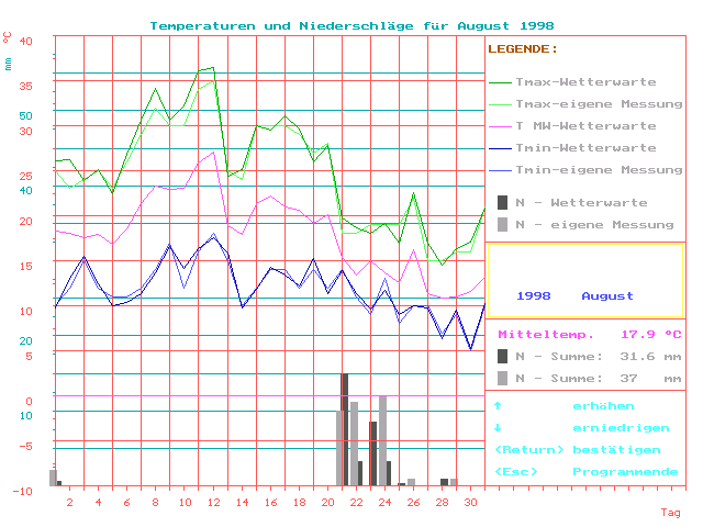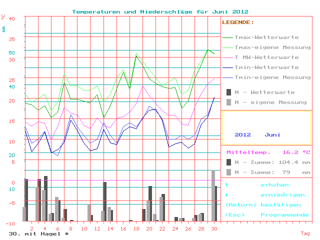 Die Angaben unter der Grafik bedeuten, dass am 25. eine eigene Messung für die Tageshöchsttemperatur fehlt und der Wert der PWSD übernommen wurde, am 26. gilt das gleiche für die Minimaltemperatur.