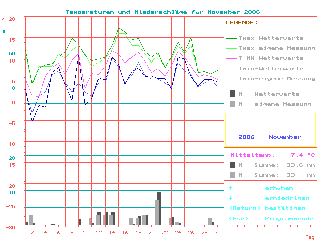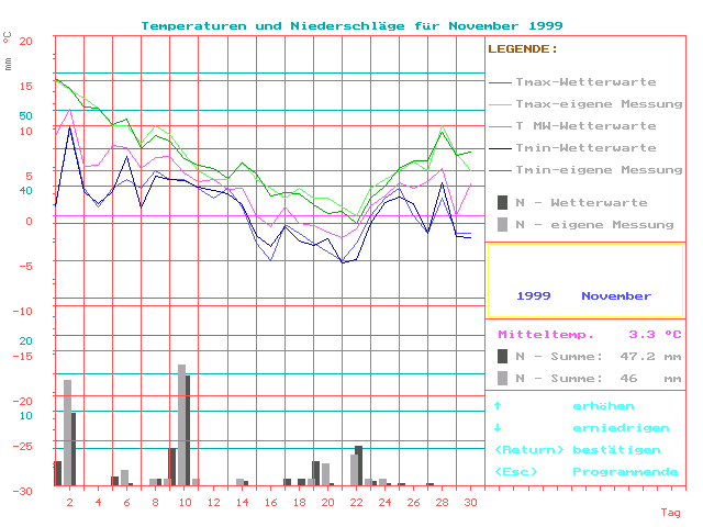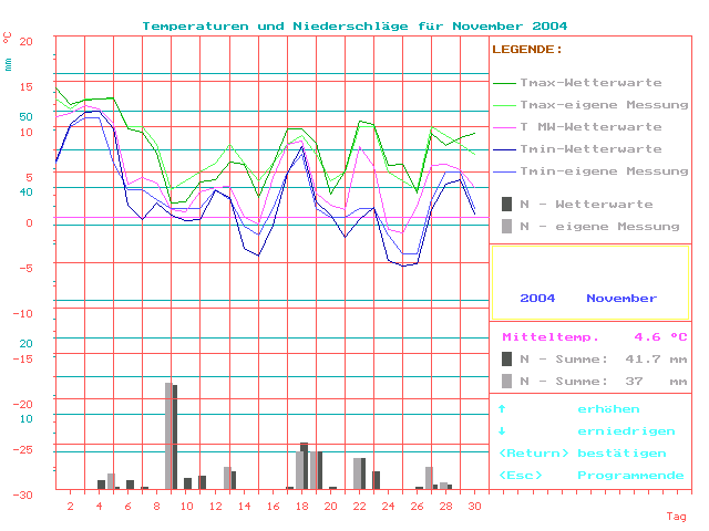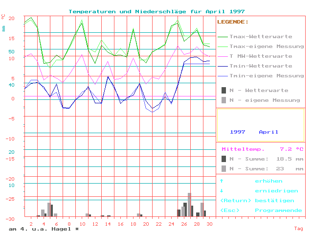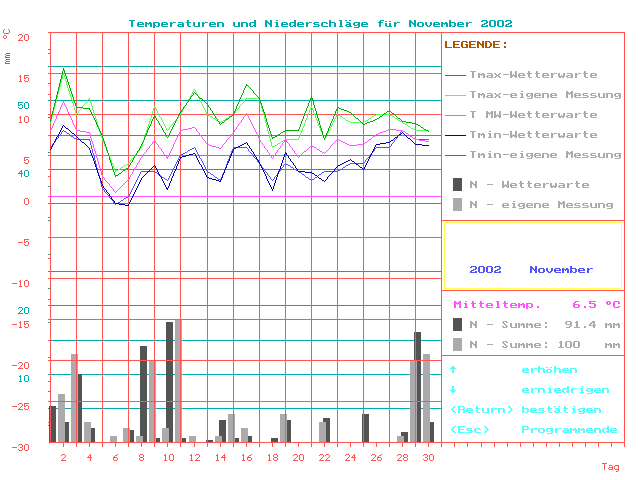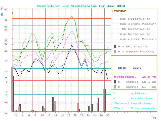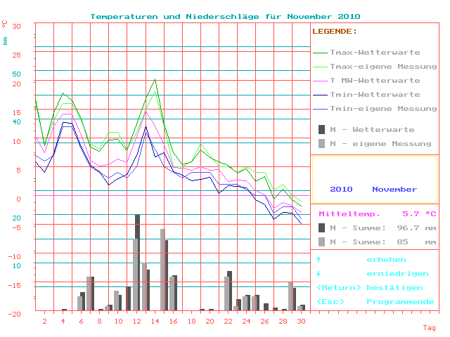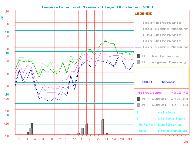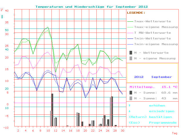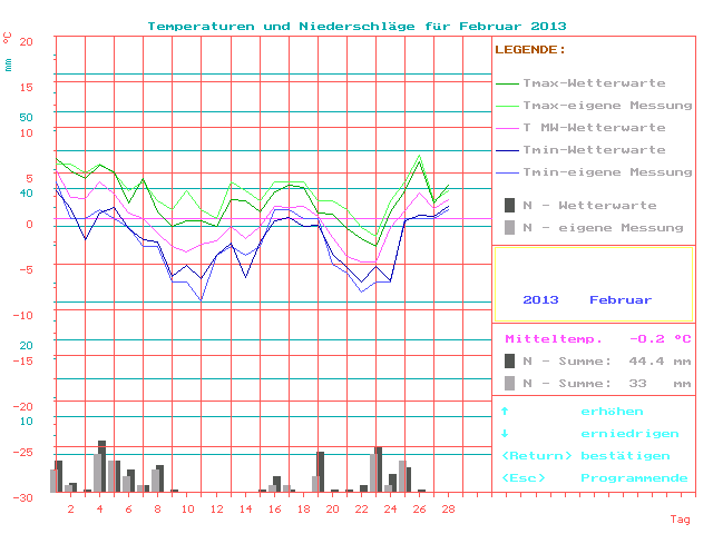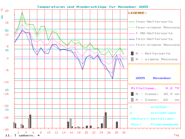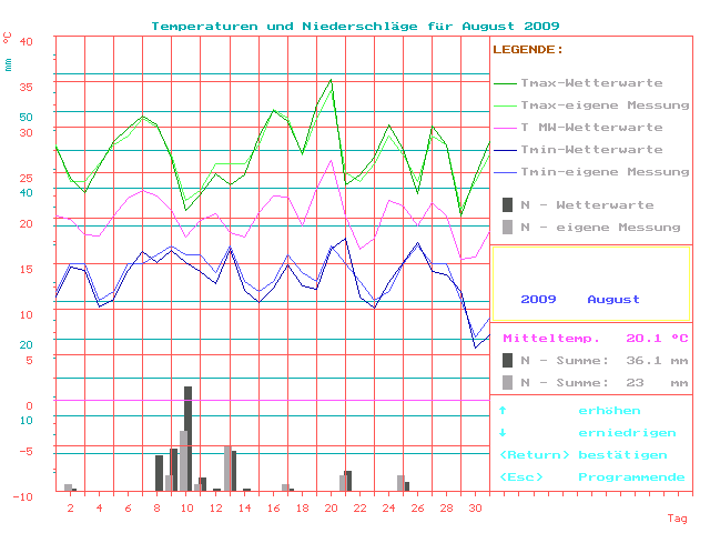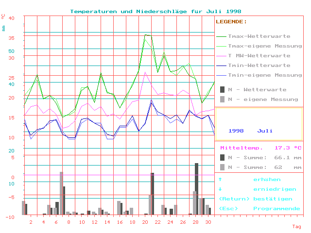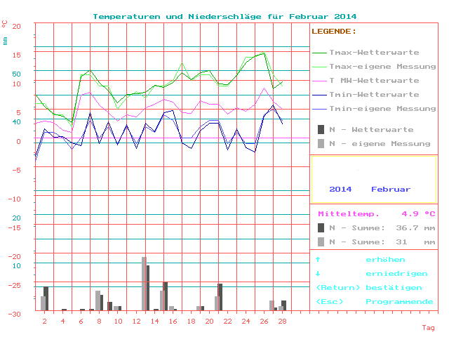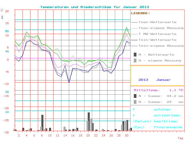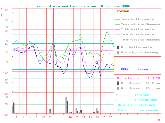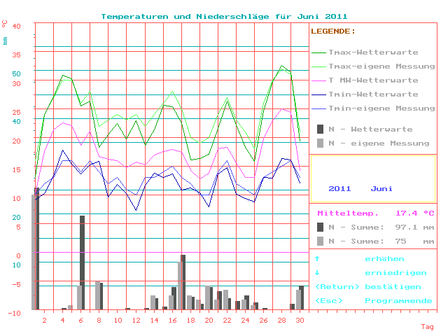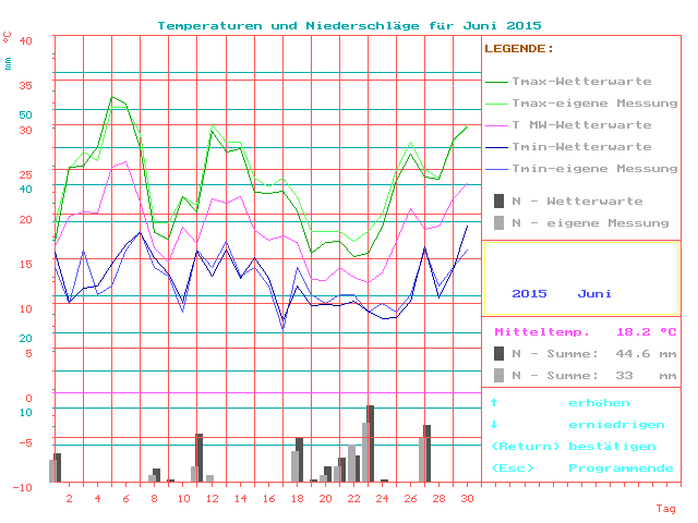 Die Angaben unter der Grafik bedeuten, dass am 25. eine eigene Messung für die Tageshöchsttemperatur fehlt und der Wert der PWSD übernommen wurde, am 26. gilt das gleiche für die Minimaltemperatur.