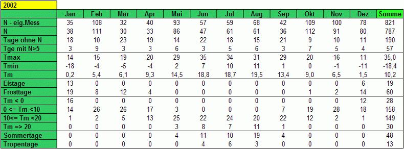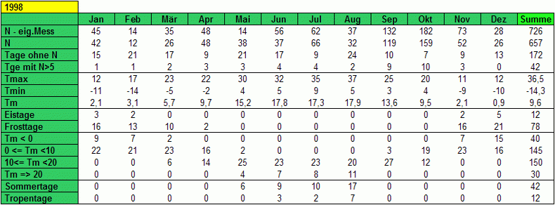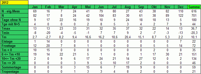 Die hier gezeigten Monats- und Jahreswerte wurden aus den Wetterdaten der privaten Wetterstation Dörnhöfer (PWSD) in Schweinfurt (www.schweinfurt-wetter.privat.t-online.de) ermittelt, zusätzlich aus den Niederschlagsmengen der eigenen Messung.