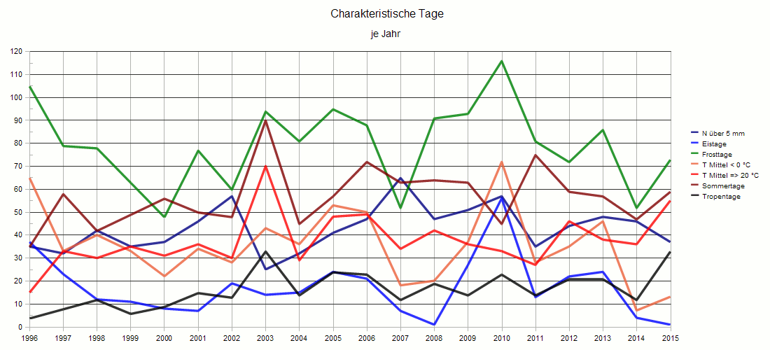Charakteristische Tage pro Jahr mit Eis-, Frost-, Sommer und Tropentagen, Tagen mit einer Mitteltemperatur unter 0 und über 20 °C und Tagen mit einer Niederschlagsmenge von über 5 mm