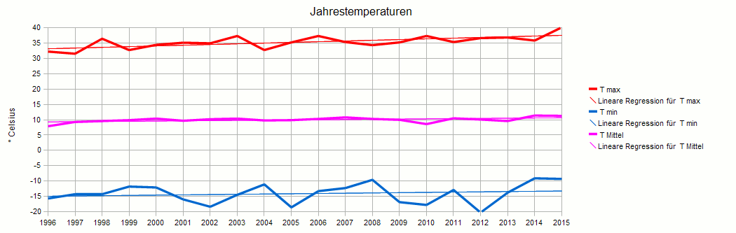 Jahrestemperaturen, d. h. höchste und niedrigste gemessene Temperatur eines Jahres, sowie Jahresmitteltemperatur (Mittel der Monatsmittel)